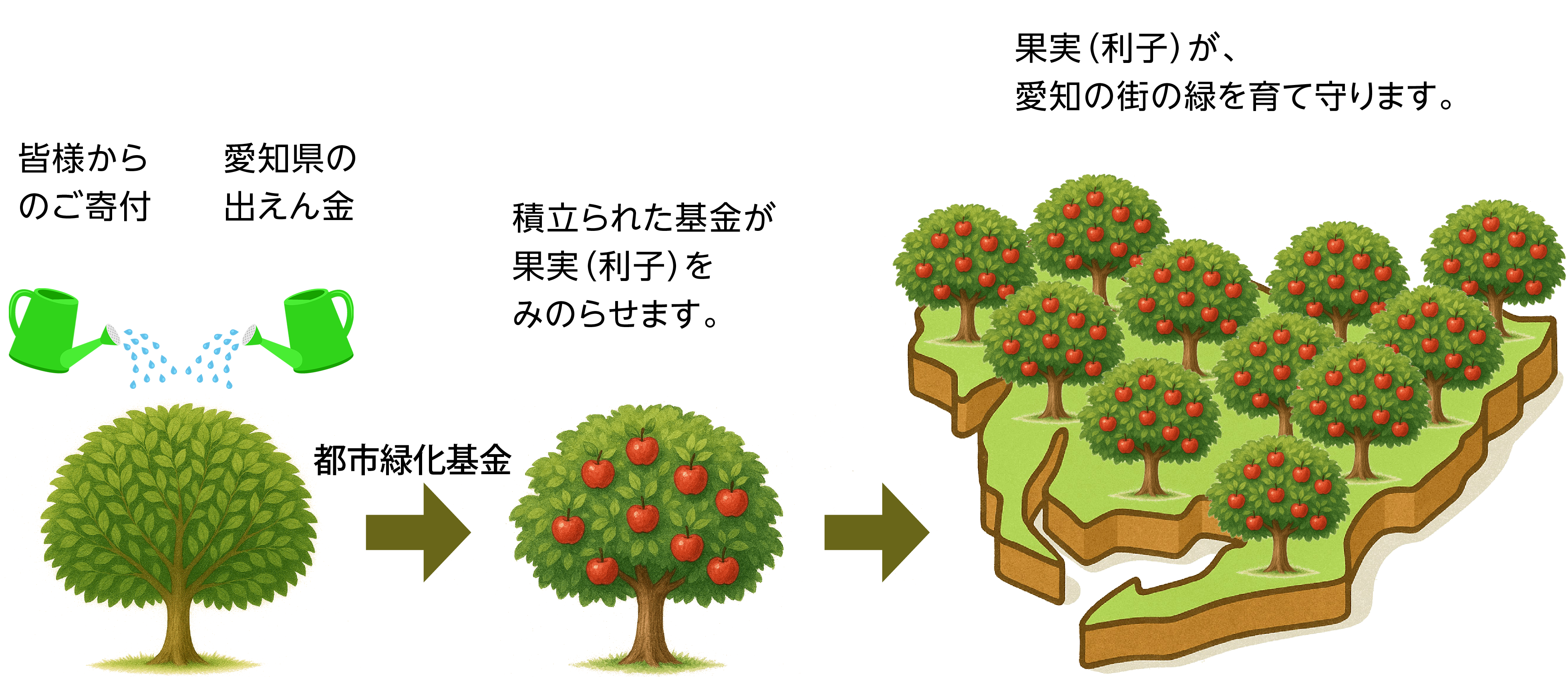 愛知県都市緑化基金は、みなさまからの寄附金と、愛知県からの出えん金を